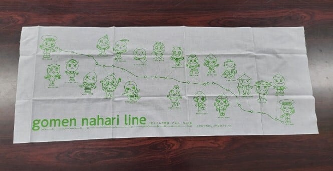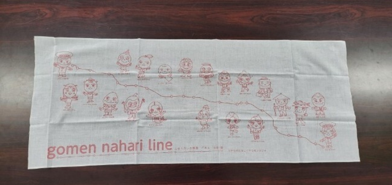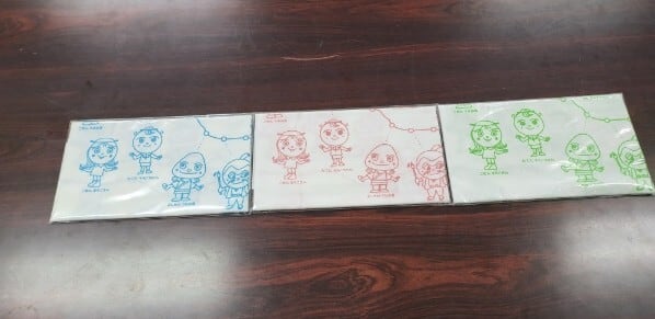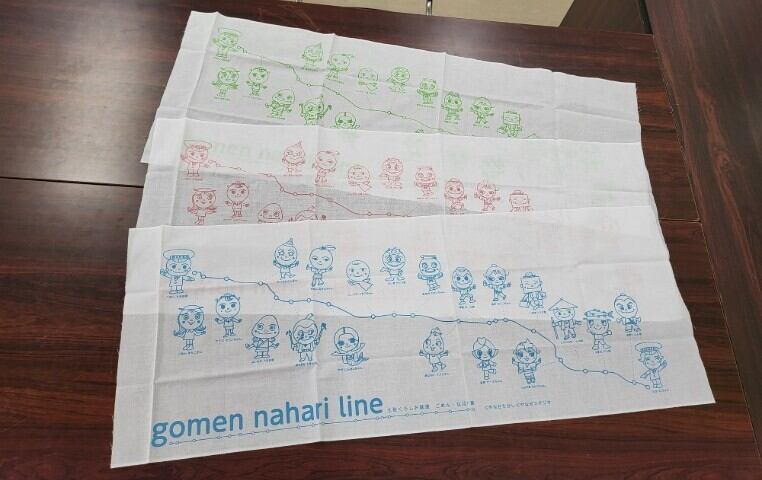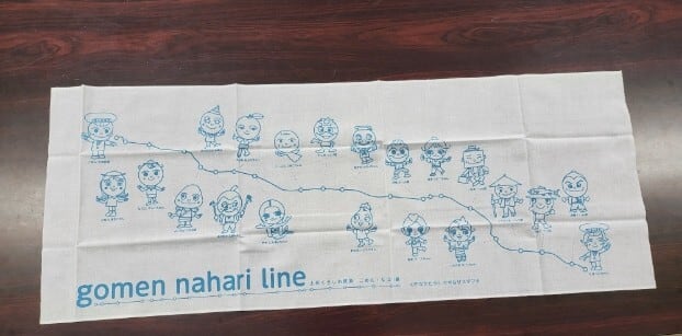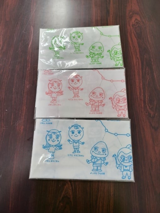 21体のキャラクターが描かれたかわいらしい手ぬぐいです。色は、青・緑・ピンクの3色から