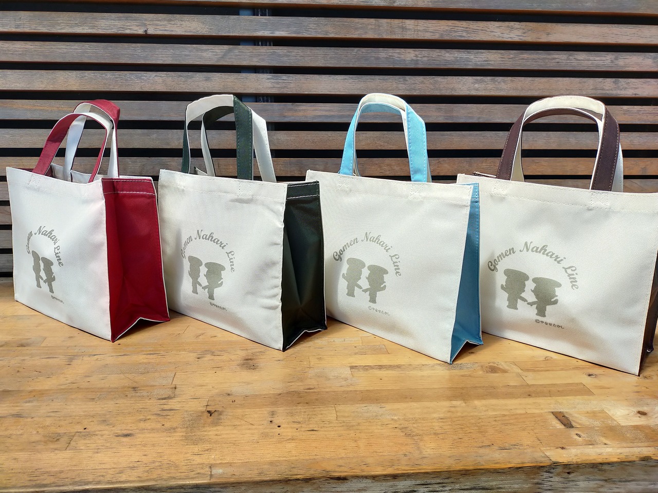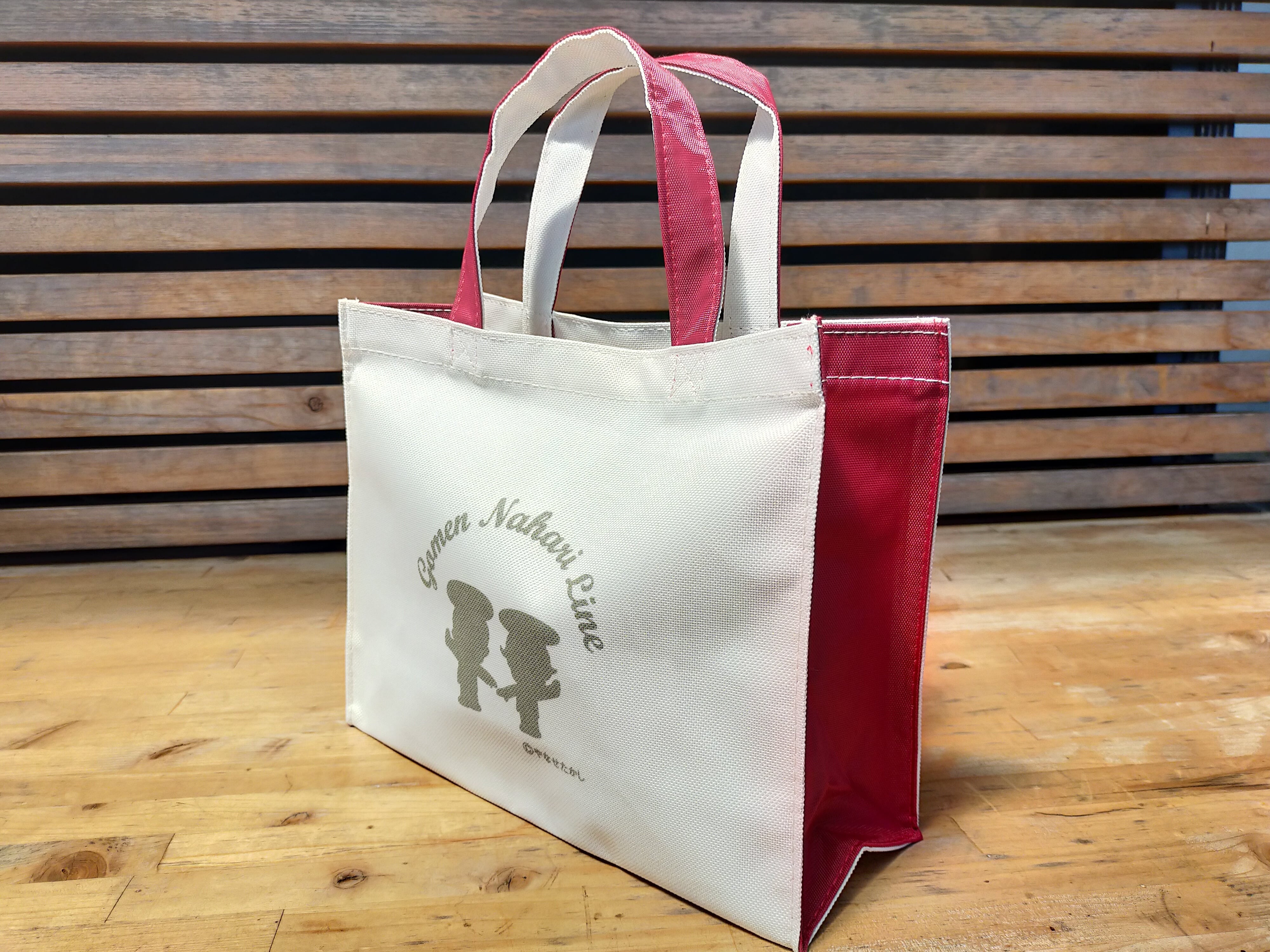 ごめん・なはり線のキャラクター「ごめん えきお君」と「なは りこちゃん」をシルエットでデザインしたミニトート。財布と携帯電話だけを入れて出掛けたり、お弁当をいれてみたりと、小さいけれど使い方はいろいろ。生地も丈夫なので長くご使用いただけます。4種類のサイドカラーがアクセントに。